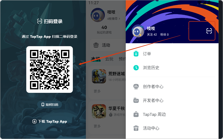 2、也可以使用TapTap手机版扫码登录