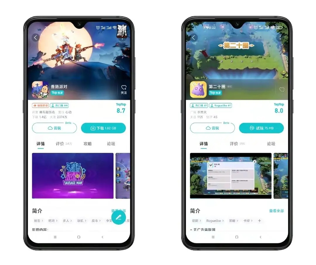 TapTap是专为中国手游玩家打在的一款高品质手游分享社区,也是第三方游戏下载应用平台。在这里你可以轻易获取各种游戏的实时讯息,一手热玩全部知晓,拥有选择困难症的你无需烦恼,休闲,娱乐,竞技,益智,解谜各种各样的游戏TapTap通通收录在里面。此外,在每个游戏的下方都有很大的版块是评论区,在评论区中,优质的评论会因为众人的点赞而被顶到最上面,从而获得更多人的认可,也可以让评论者获得成就感。玩家可以从评论区中找到游戏攻略。TapTap让你快人一步先体验到游戏乐趣。