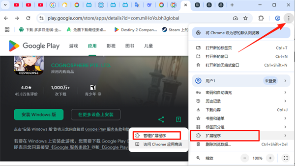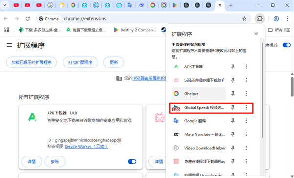 1、在本站下载解压后即可获得global speed插件文件,找到需要安装插件的浏览器,这边以“谷歌浏览器”为例,点击左上角的三个点标识,选择扩展程序-管理扩展程序;