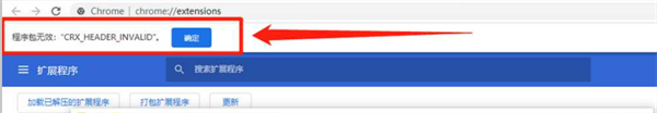 如果你拖入crx文件后没有任何反应,或者出现下面错误