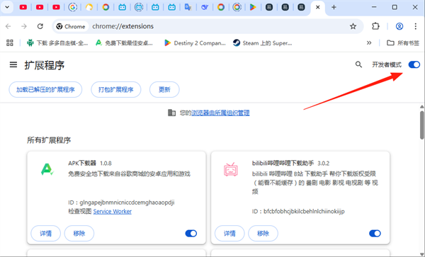 2、如图所示,开启“开发者模式”【安装前,一定要将开发者模式勾选上;不勾选开发者模式是安装不上插件的】;
