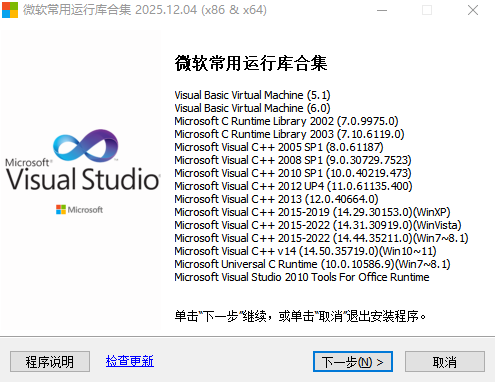 微软常用运行库合集微软常用运行库合集是一款为电脑提供的综合运行库解决方案,是目前为止最全最新的运行库集合!其中整合了目前最新的、最常用的VC运行库版本,内置了常用的Microsoft Visual C++ 2005、2008、2010、2013、2015、以及Visual Basic Virtual Machine、Microsoft C Runtime Library等等,一键即可全部安装,轻松解决运行库出错的烦...