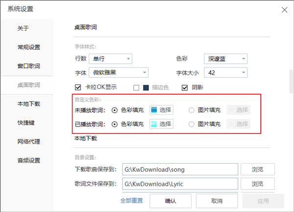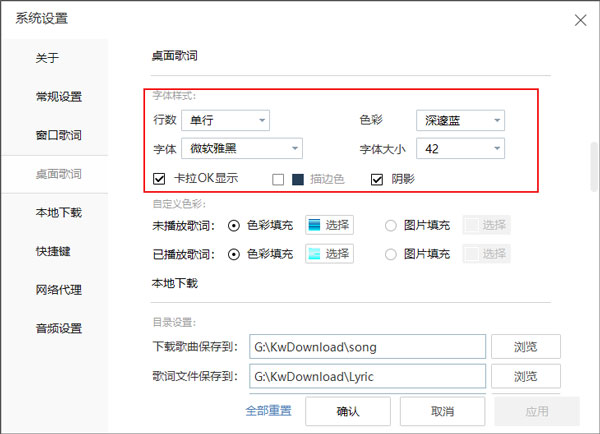 4、进去酷我桌面歌词设置界面之后,可以设置桌面歌词的字体样式和色彩;