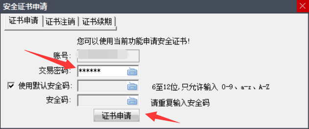 (2)点击“认证方式”右侧钥匙图标进入证书申请界面,输入交易密码并点击“证书申请”。