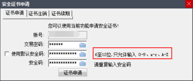 注意:登录时非“默认安全码”和“默认安全码”模式申请的证书不可混用!