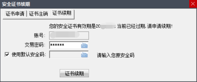 (1)证书即将或已经过期时,可对证书进行续期。点击“认证方式”右侧,进入“证书续期”,输入交易密码及安全码(仅手动设置安全码时需输入,“默认安全码”时无需输入),点击“证书续期”。