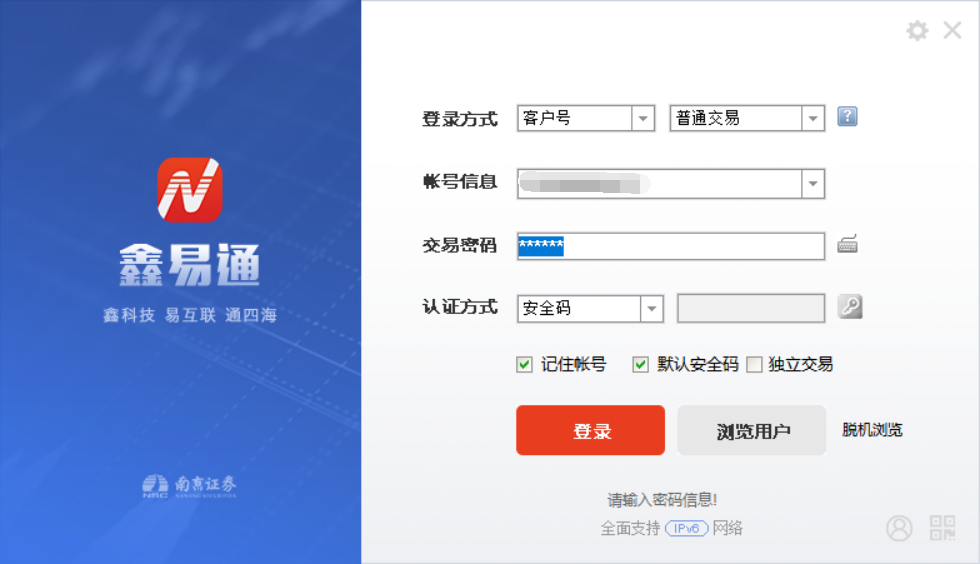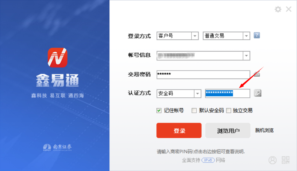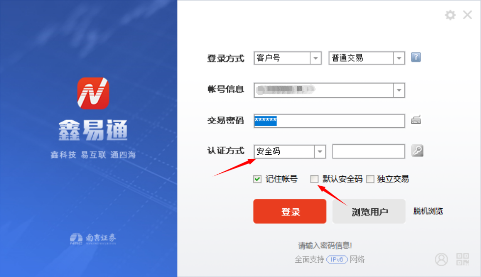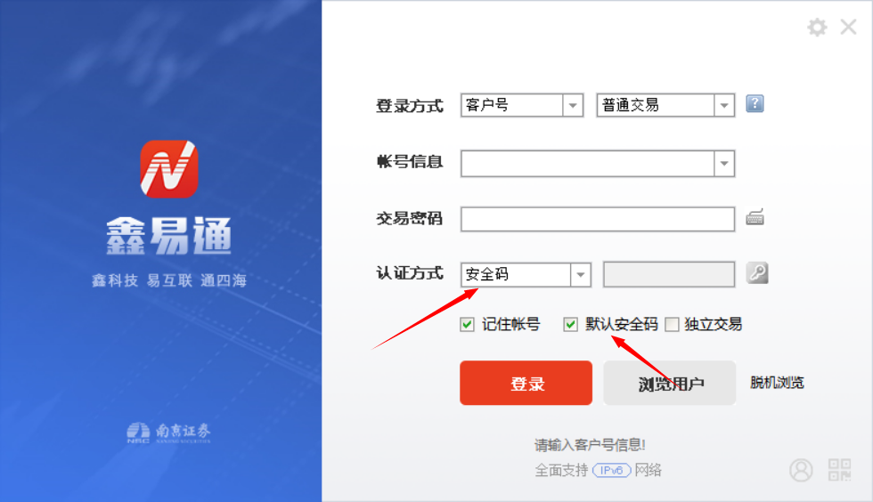 (1)输入账号、密码,认证方式是“安全码”且不勾选“默认安全码”。