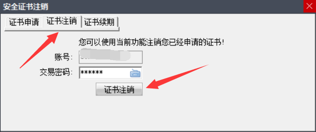 (1)点击“认证方式”右侧,进入“证书注销”,输入交易密码,点击“证书注销”。