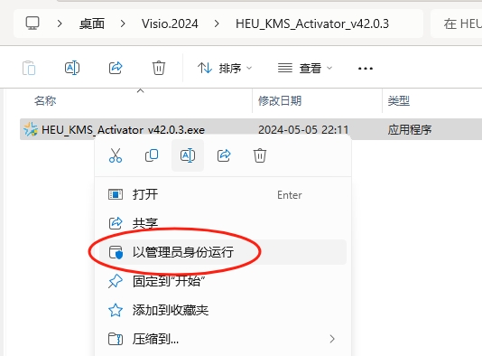 07、右键刚刚解压出来的程序【HEU_KMS_Activator_v42.0.3.zip】,点击【以管理员身份运行】。