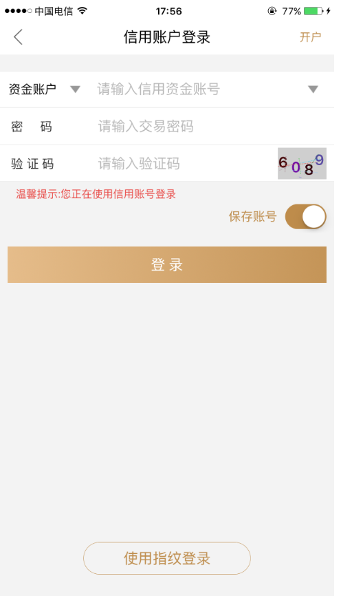1、登录:选择“信用账户”,输入“信用资金账号”、“密码”和“验证码”后登录。