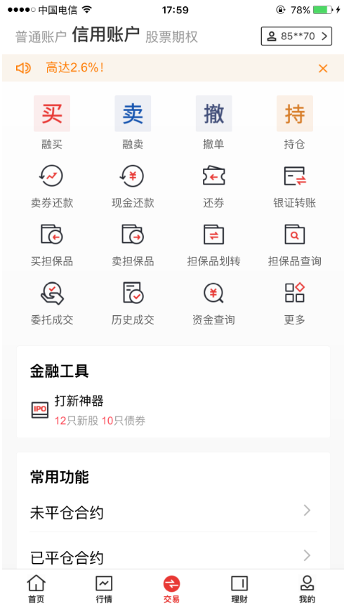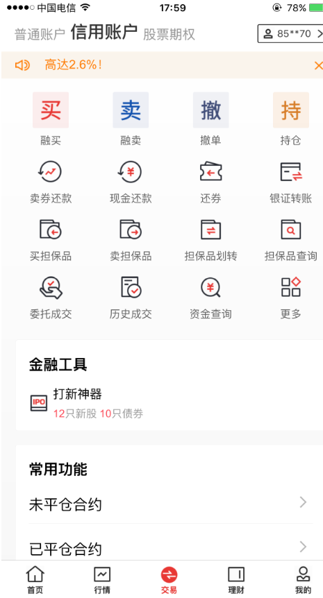 普通交易、融资融券、开放式基金、分级基金、股转交易,金融超市层级产品一应俱全,任凭君选