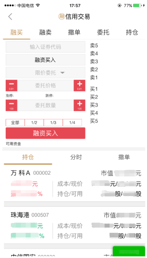 (1)融资: 在“融买”目录下默认“融资买入”,输入“证券代码”、“委托价格”、“委托数量”确定完成。