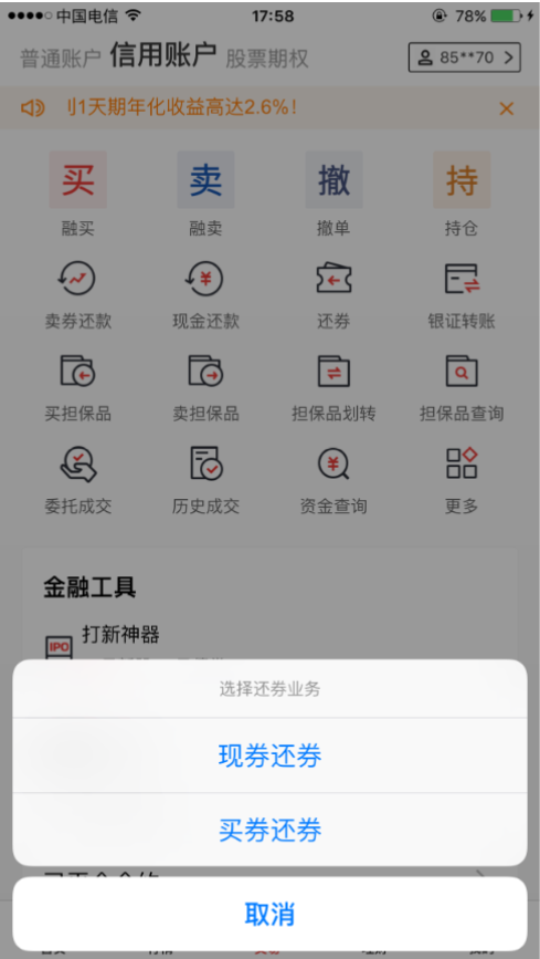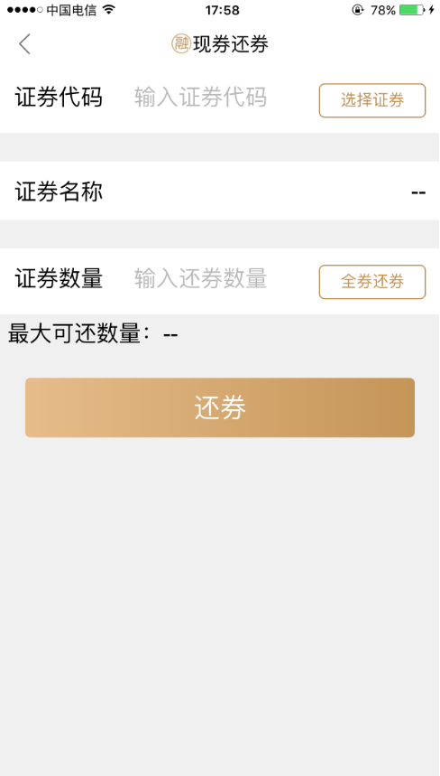 b、“现券还券”方式:在“还券”目录下,选择“现券还券”,输入“证券代码”、“证券数量”确认完成。(还券按时间顺序,先偿还最先到期的融券。)