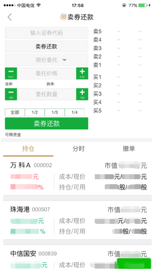 a、“买券还券”方式:在“还券”目录下,选择“买券还券”,输入“证券代码”、“委托价格”、“委托数量”确认完成。(还券按时间顺序,先偿还最先到期的融券。)
