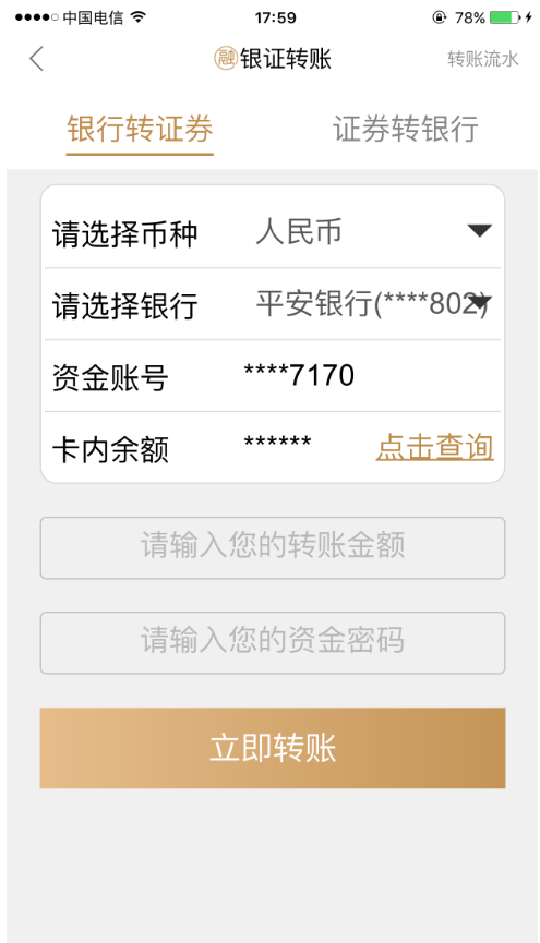 (4)“银证转账”:在“信用账户”目录下,选择“银证转账”,在“银证转账”下选择“银行转证券”或“证券转银行”,输入“转账金额”和“资金密码”,点“立即转账”完成。