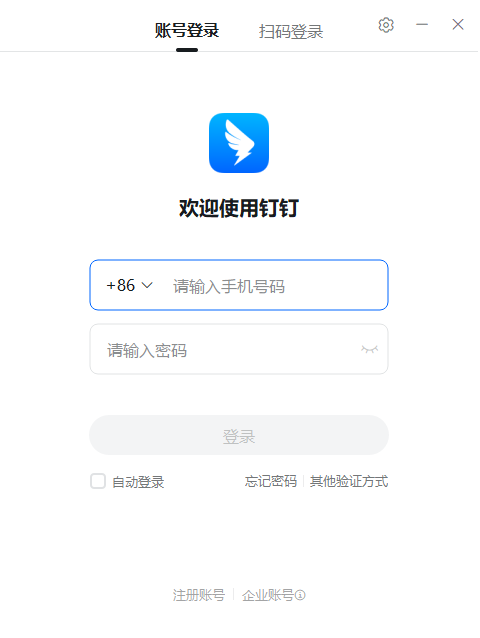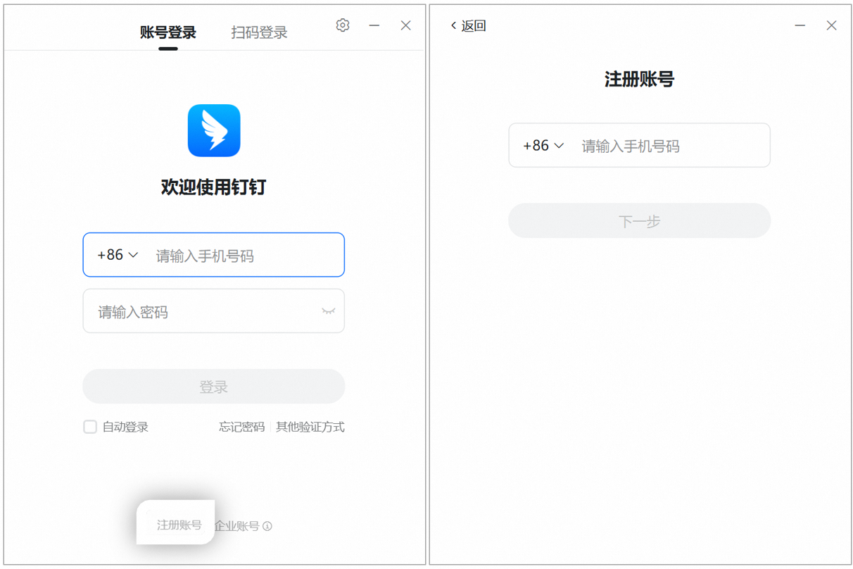 电脑端钉钉 在引导页点击下方 注册账号,打开后可直接 输入手机号、验证码 ,点击 注册 。