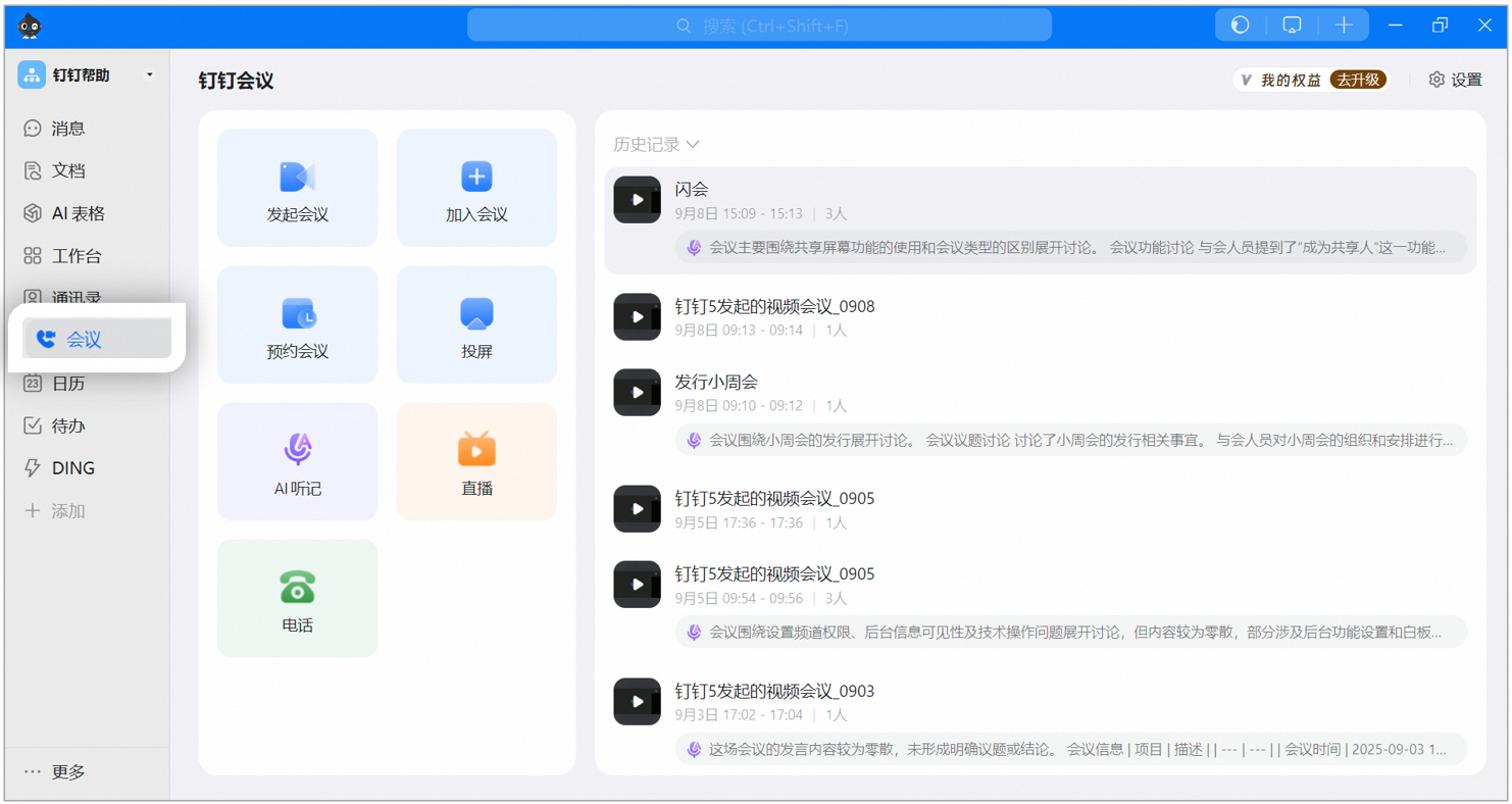 击左侧菜单栏中的会议, 即可发起视频会议。