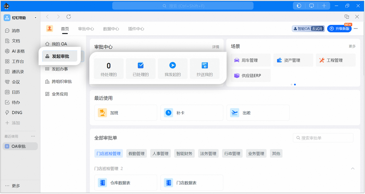 进入【工作台】-【OA审批】,点击需要发起的审批,填写信息后提交即可,提交成功后可在【已发起】中查看审批处理进度。