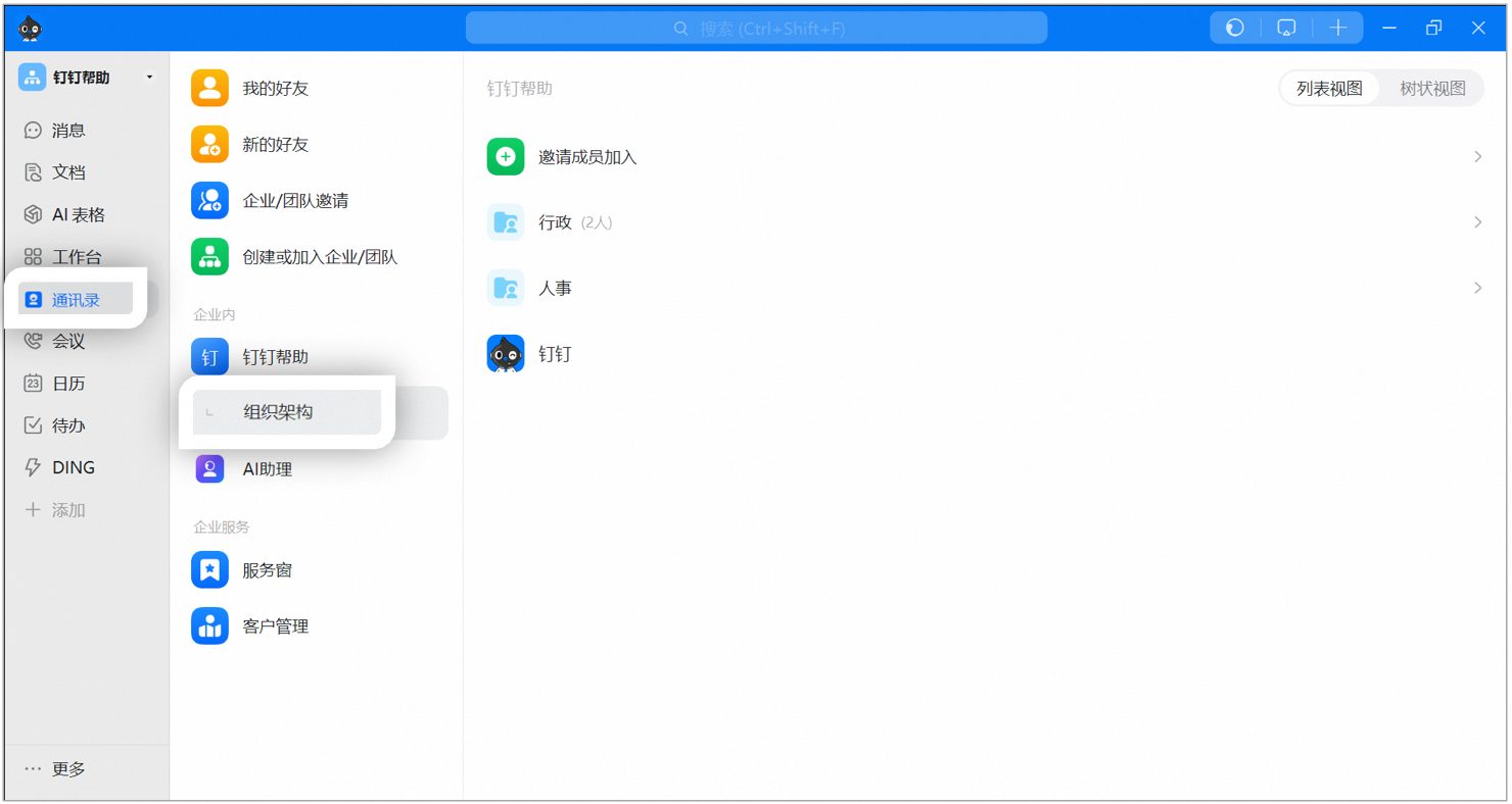 点击左侧菜单栏中的通讯录->进入组织架构,如下图所示: