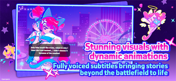 拥有丰富的角色设定与剧情篇章,每位角色拥有独特的技能与背景故事,通关解锁剧情碎片,逐步揭开音乐世界拯救计划的主线故事。