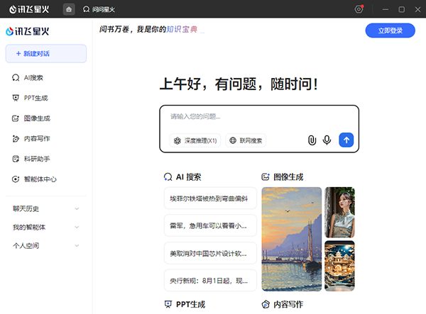 讯飞星火电脑版是由科大讯飞基于全国产算力、自主研发的新一代认知智能大模型平台,基于自然对话的方式,实现对用户任务的高效理解和执行,提供包括语言理解、知识问答、逻辑推理、数学题解答以及代码理解与编写等在内的多元化服务,广泛应用于营销、创作、编程、聊天、学习等多个领域!
