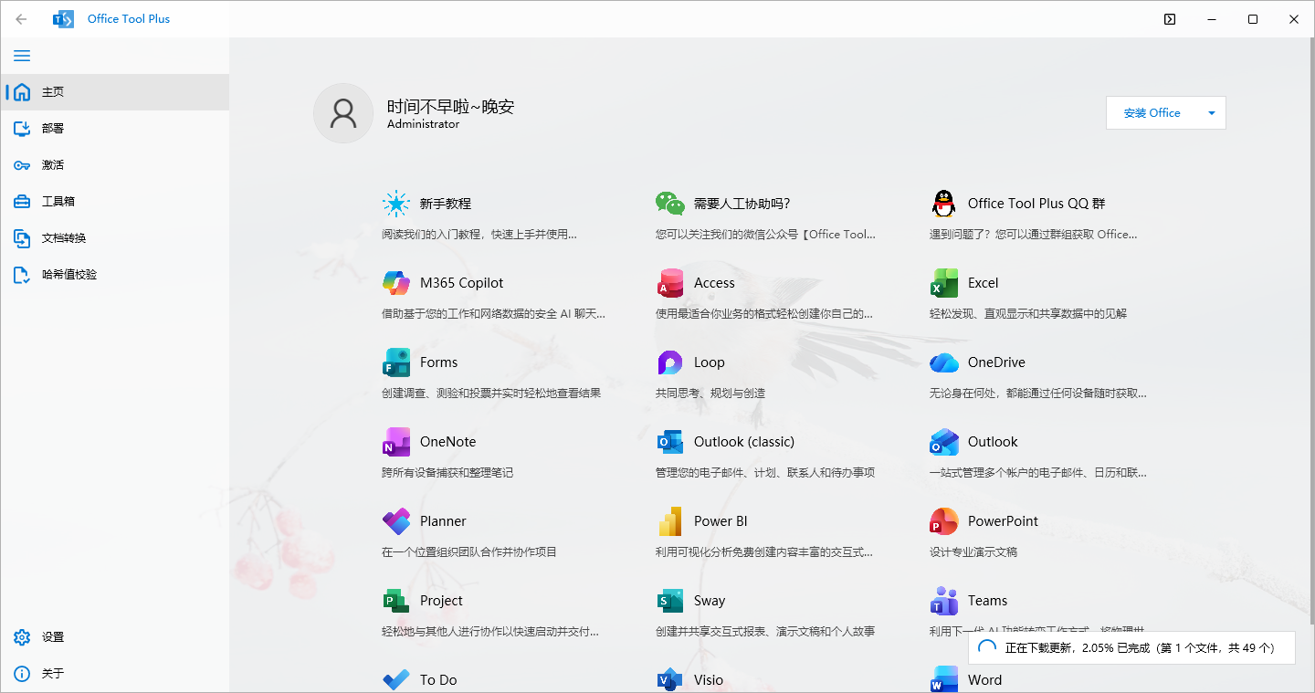 Office Tool Plus官方版Office Tool Plus官方版是一款简单小巧的 Office 工具,能帮助您部署并管理Office!在这里你可以高速下载Office,自定义安装Office,对Offic 进行激活配置等,从下载到激活一站式服务。并且软件支持自动更新、离线安装包生成、无缝集成微软账户,还有简洁直观的用户界面、高级配置选项、完整日志记录功能,且不修改注册表,支持微软 VLSC 授权。无论你是个体还是团队,Of...