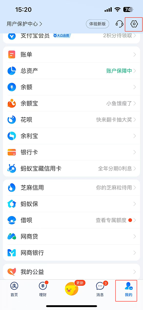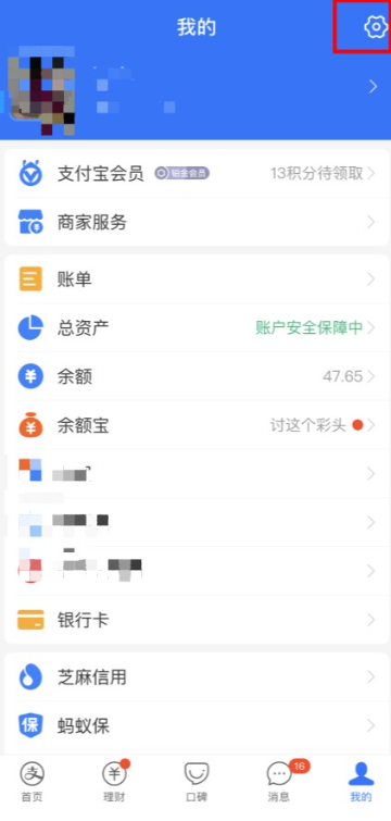 1、首先打开【支付宝】客户端,然后点击右下角【我的】,点击右上角【设置】图标;