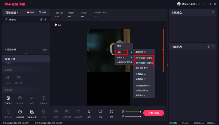 3、在画面上单击鼠标右键出现选项,选择变换 - 旋转 旋转角度跟摄像头、摄像机旋转角度保持一致;