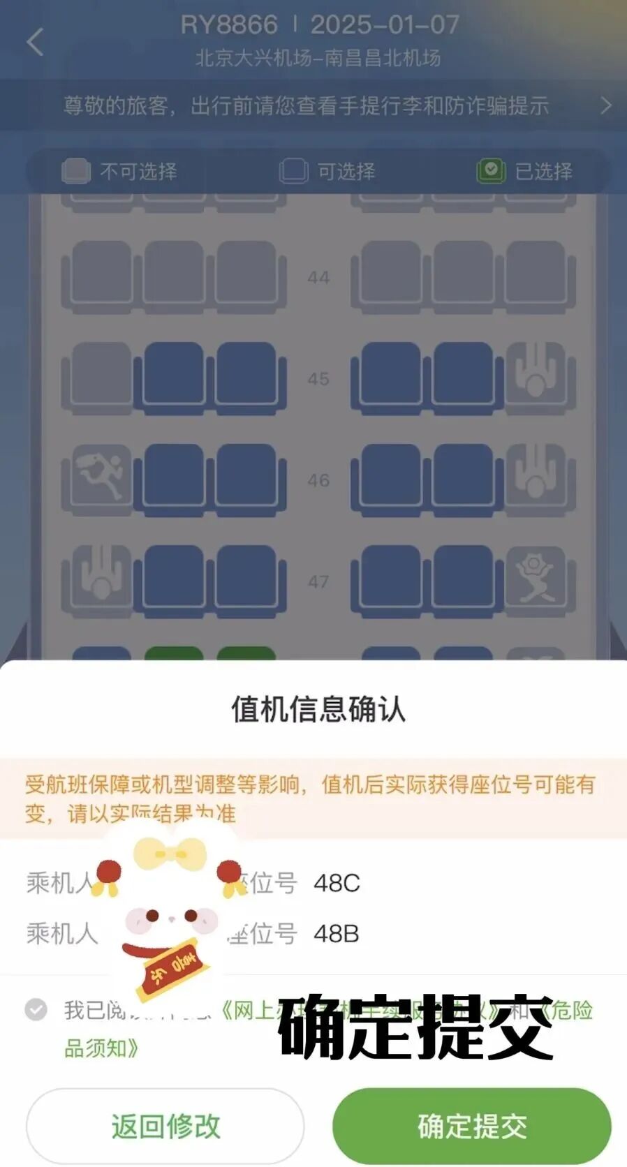 6、选好座位后点击“确认座位“就算选定啦,再点击“提交选座”——“确定提交”就会跳转到“值机成功”的页面,这时候,你的线上选座就算完成了;