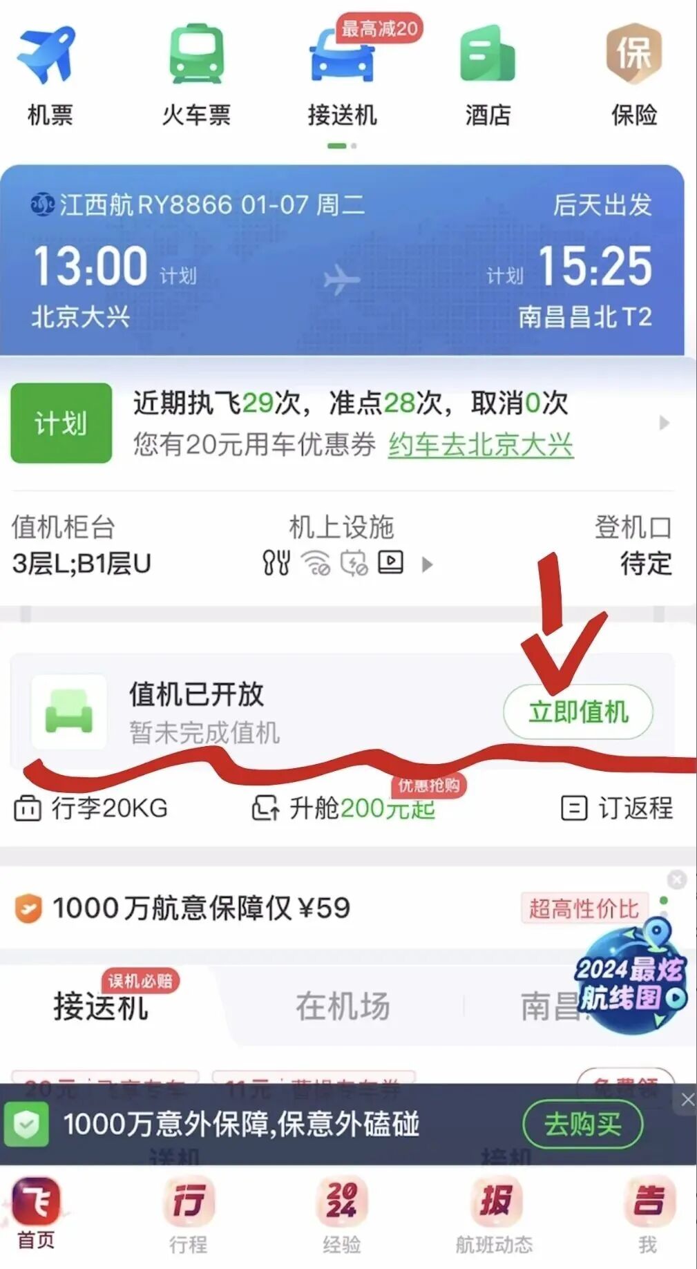 2、首页航班信息的下面,我们可以看到“值机已开放”(未完成值机,旁边会有“立即值机”的选项);