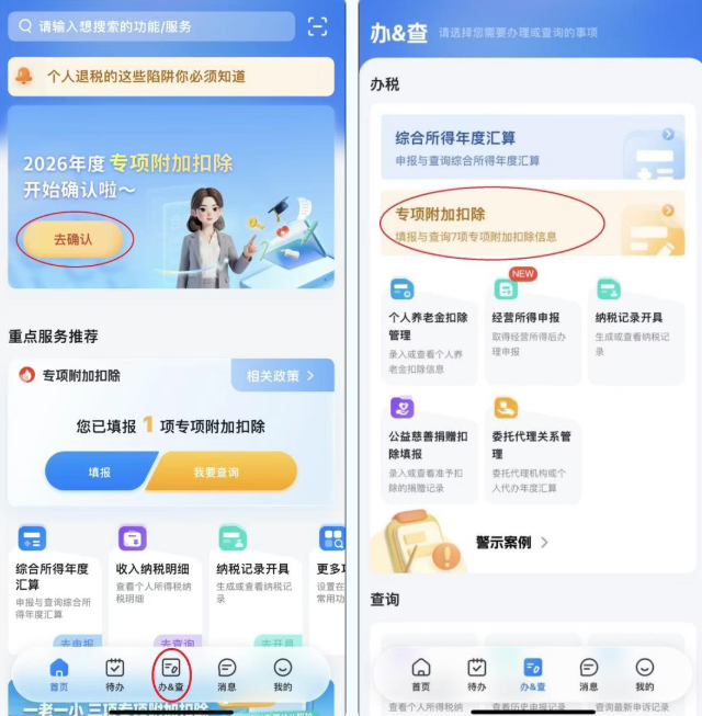 1、打开个人所得税APP,点击首页的“去确认”,或底部“办&查”,进入“专项附加扣除”。