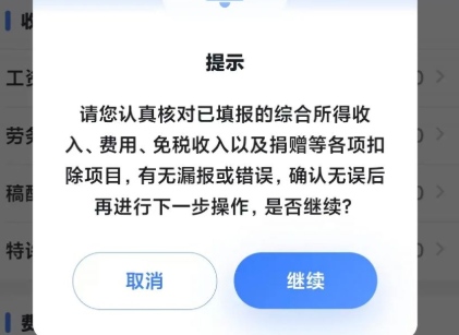 8、接着需要检查收入、费用、免税收入和税前扣除等内容,确认无误后点击【下一步】和【继续】按钮。