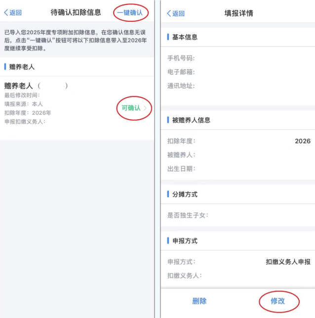 4、确定后,进入“待确认扣除信息”,核对“可确认”状态的专项附加扣除,如有修改,可以点击“修改”,信息确认无误后点击“一键确认”,如有“已失效”状态的信息,则需先删除或修改后才能点击“一键确认”。