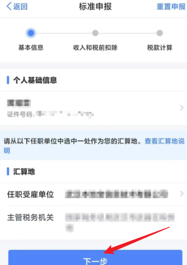 5、跳转界面后需要检查个人基础信息,然后选择【任职受雇单位】并点击【下一步】。