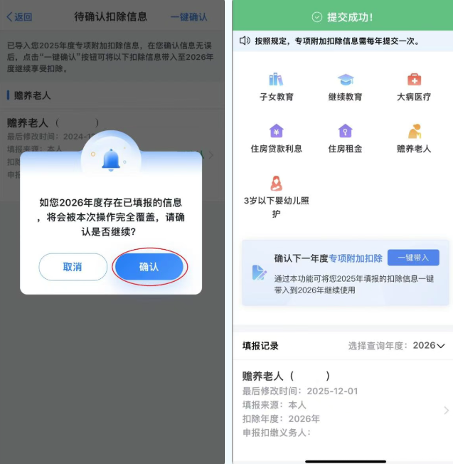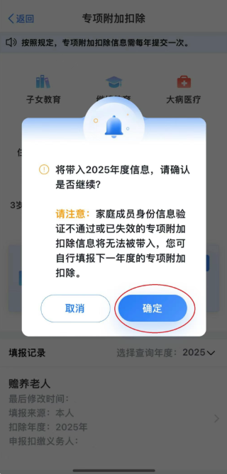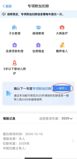 2、可直接“确认下一年度专项附加扣除,一键带入”。