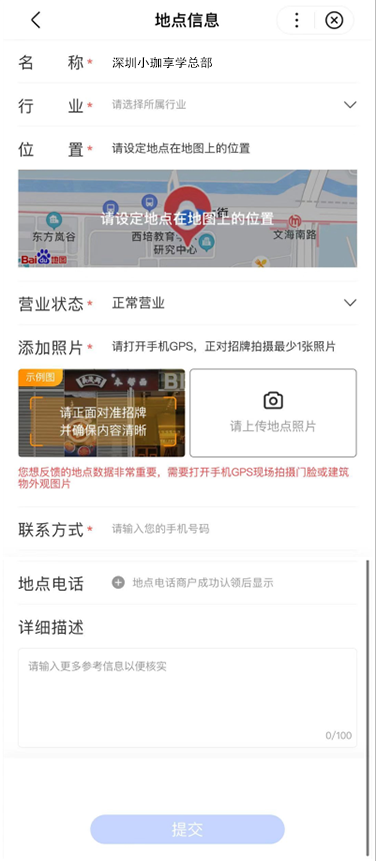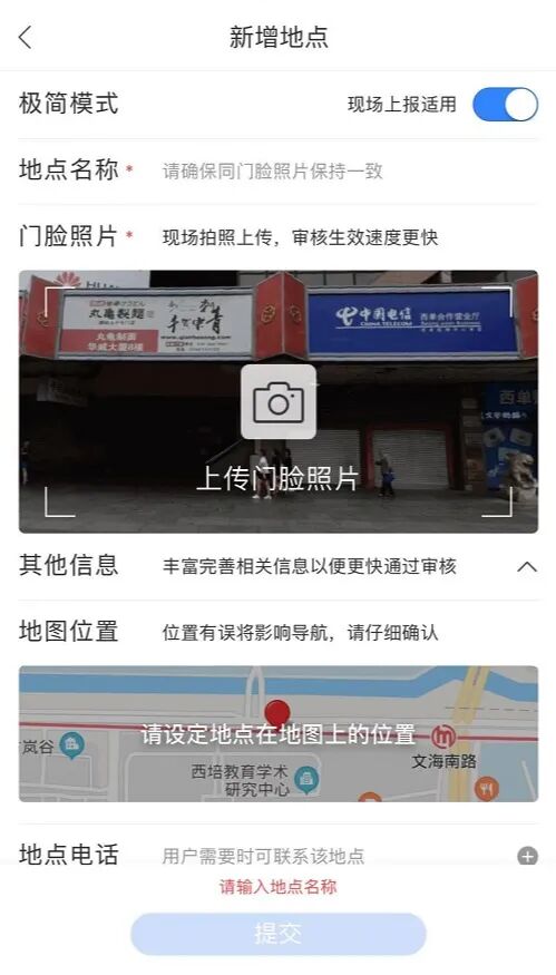 5、若上报地点时不在,则将“现场上报适用”关闭,然后将“地点名称”、“门脸照片”等信息填好后提交,并等待审核。