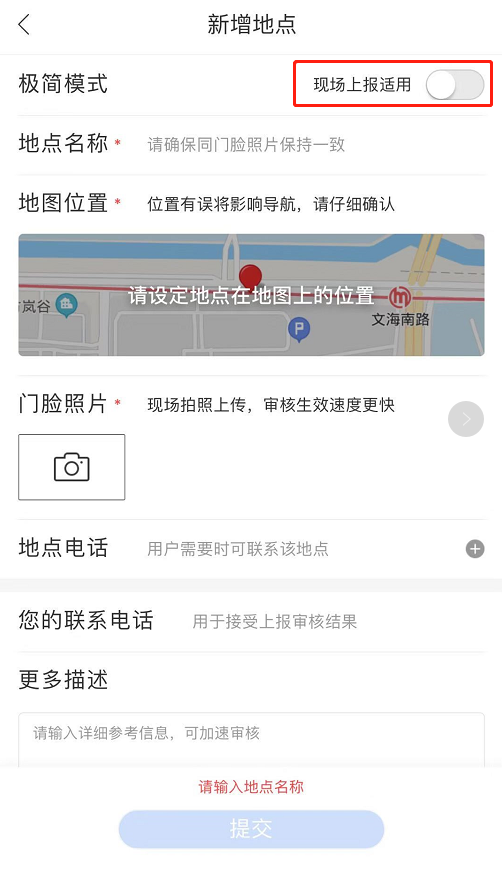 4、若上报地点时正在店面,选择“现场上报适用”,然后将“地点名称”、“门脸照片”等信息填好后提交,并等待审核。
