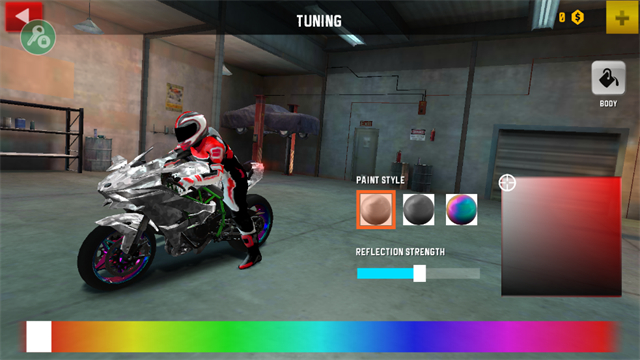 3、自定义改装系统:解锁多种摩托车型,并可对轮胎、发动机、车架等部件进行升级改造,打造专属座驾。