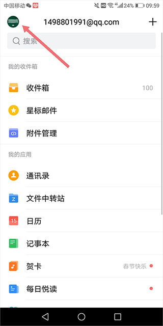 1、用户进入qq邮箱页面后,可以点击顶部左上角的qq头像或微信头像(下图红色箭头所指区域);