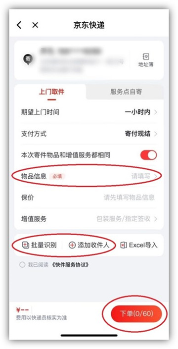 2、进入页面填写所有必填项,通过“批量识别”或“添加收件人”填写收件人信息,核对无误后点击下单。