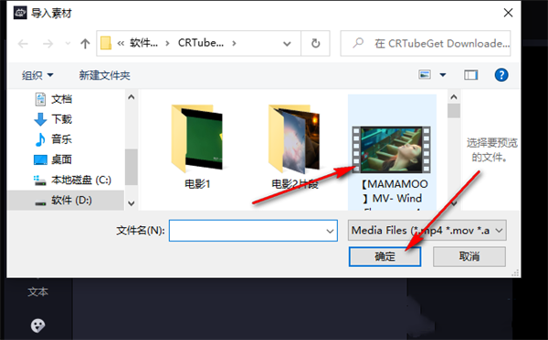 2、进入视频剪辑页面之后,我们在页面左上角先点击“导入素材”选项,然后在文件夹页面中找到自己需要的视频素材文件,选中之后点击“确定”选项。