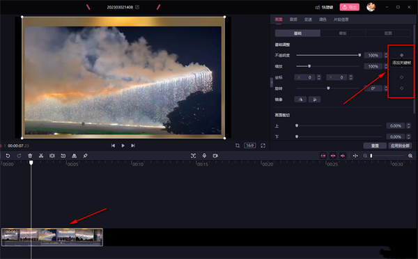 4、将视频添加到轨道之后,我们先点击轨道中的视频,然后在页面右上角的画面设置中,我们可以看到每个选项的右侧都有一个菱形图标,这个图标就是关键帧图标,点击该图标就能在视频中添加一个关键帧了。