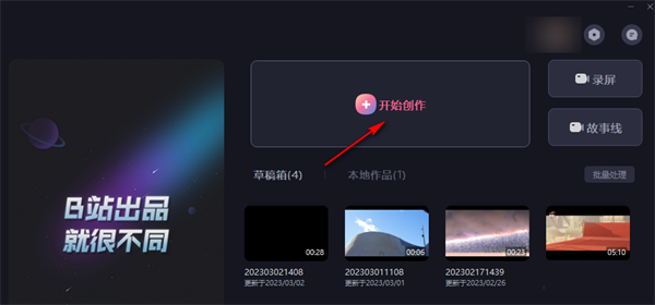 1、我们先在电脑中打开必剪软件,然后在软件页面中点击“开始创作”选项。
