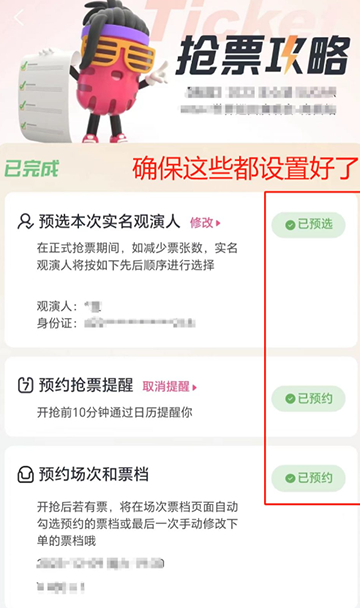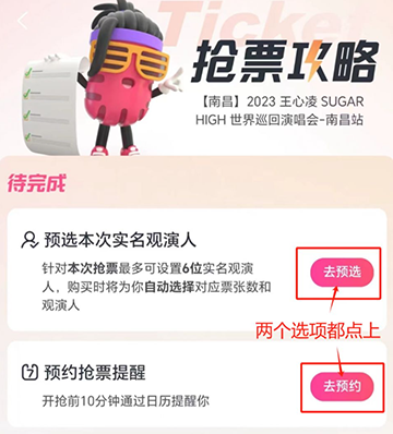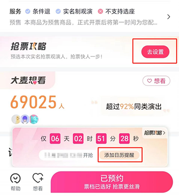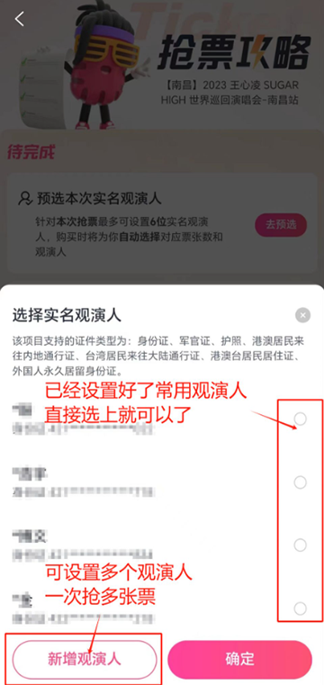 1、在演唱会开票前点击"添加日历提醒"和“抢票攻略”的提示,进入“抢票攻略”这个提示,提前选好观演人。可设置多个观演人,同一个订单优先连座。(一个订单可抢多人门票,提前设置多个观演人,可以购买多人连座门票)
