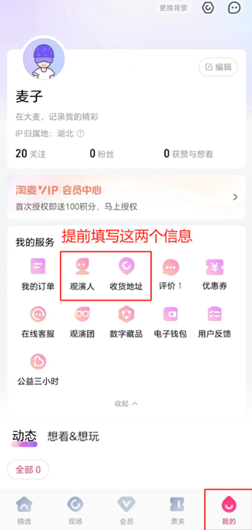 1、下载大麦APP,进入大麦APP首页,点击右下角“我的”,提前填写“观演人”、“收货地址”这两块信息;