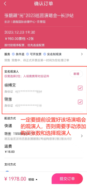 抢票前可以提早找个其他有票的演唱会进行演练一遍,只要最后不支付就没关系。抢票时要确保自己都已经设置好观演人和收货地址,注意实名观演人需打勾,配送地址是选好的,支付方式确认一下即可。