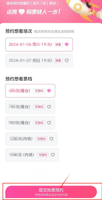 3、抢票前检查一下,确保图示框选部分都设置/升级好,提前预约想看的[ 场次 ] 和[ 票档 ]