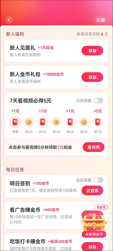 2、作为新人是最容易赚钱的,不仅提供了新人福利奖励,并且只需要看视频签到7天就能够立刻获得现金奖励,除此之外,还可以做每日任务来增加金额。