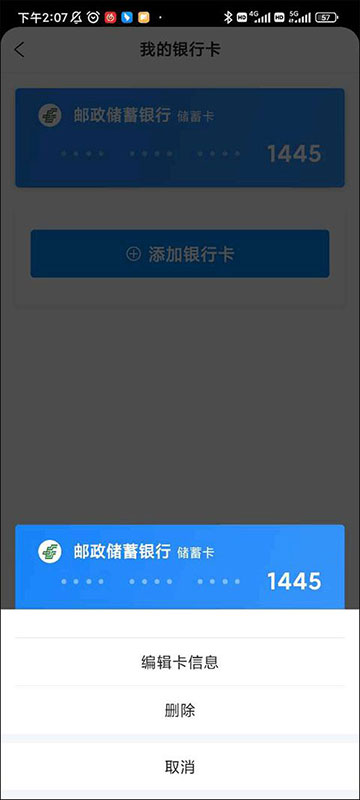 4、可以看见这个时候底部弹出了一个列表,列表内有三个可以点击的选地方,分别是:编辑卡信息、删除、和取消;编辑卡信息,顾名思义就是对银行卡内的绑定信息进行更改,而第二个选项删除是我们寻找的解绑功能了,这个时候我们点击它。