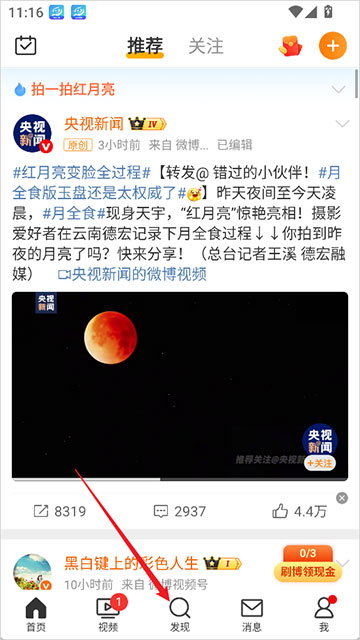 1、打开微博App,点击底部导航栏的【发现】按钮。